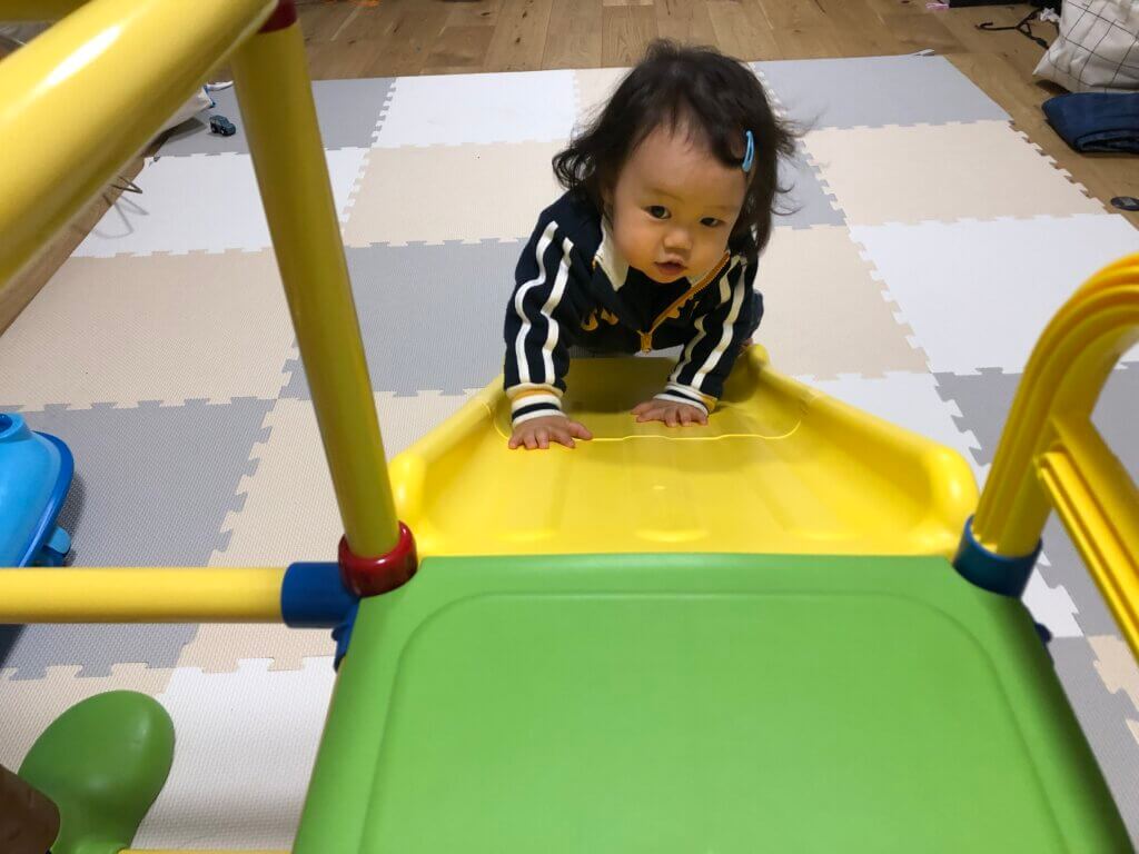 少し前の写真ですが、すべり台遊び 公園のすべり台は全然やりたがらないですが、おうちのは、自ら登ります! 登ることで体幹が鍛えられ、すべることで力を抜くことを覚えます。