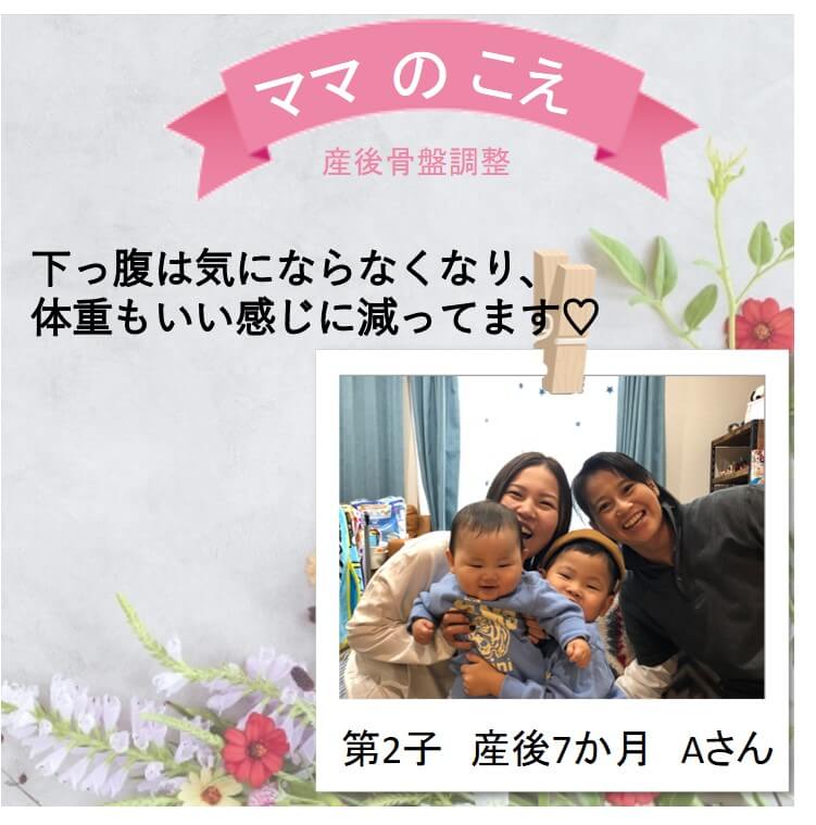 8回コースを修了したママの感想です 施術を受けようと思ったきっかけを教えて下さい 1人目の時に骨盤矯正をせずに、2人目妊娠、出産をし、体がボロボロで痛み(股関節)もある事から産後半年までにしよう!!と決意。下っ腹が出て、産前の体型になかなか...