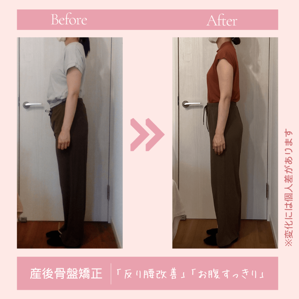 泉佐野市 コース修了ママの”Before After”[br num="2"] 反り腰が改善! 横からも後ろからもきれいな立ち姿になりました[br num="2"] 咲ららの【産後骨盤矯正】は、 「女性セラピスト」 による 「痛くない整体」です。