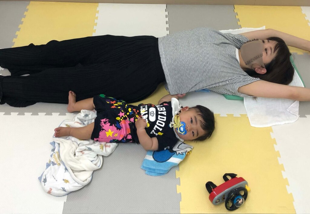 途中からベビーがぐずってしまったので、ママも下におりて隣で施術。ママの服の裾を持ってる姿がかわいらしい♡♡ ママとベビーが安心できるスタイルで施術します(^^)