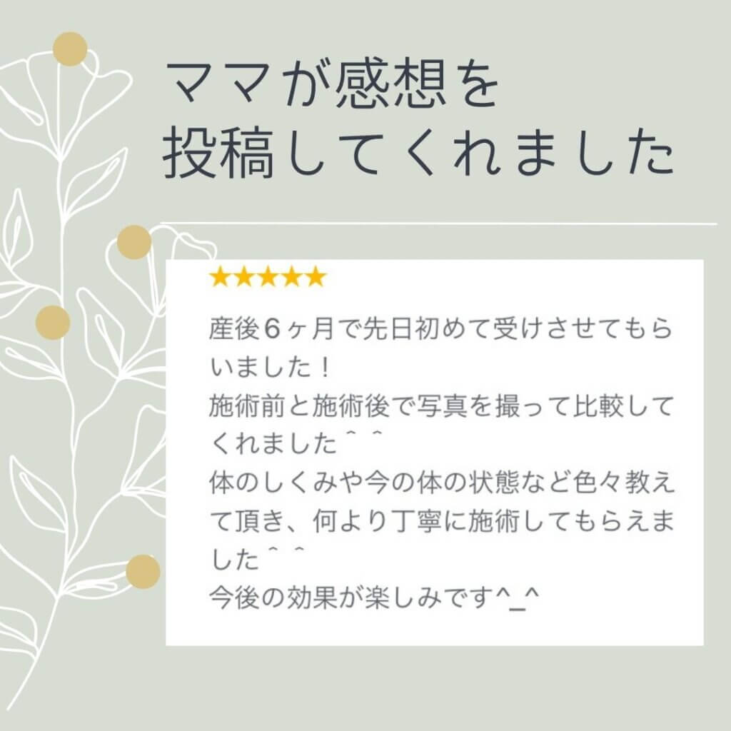 産後6か月で先日初めてうけさせてもらいました! 施術前と施術後で写真を撮って比較してくれました^^ 体のしくみや今の体の状態などいろいろ押してて頂き、何より丁寧に施術してもらえました^^ 今後の効果が楽しみです^ー^