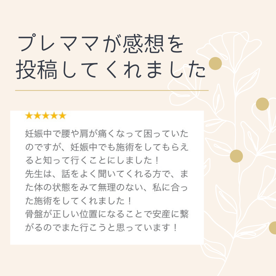 「妊娠中で腰や肩が痛くなって困っていたのですが、妊娠中でも施術してもらえることを知って行くことにしました!